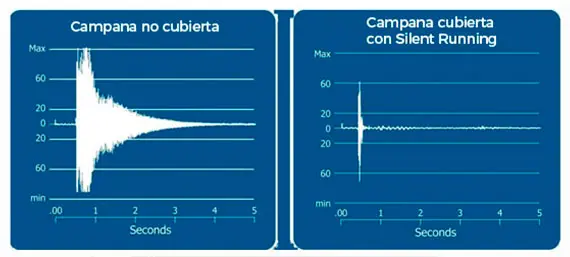 Los siguientes gráficos comparan el comportamiento acústico de una campana sin recubrimiento frente a otra tratada con Silent Running SR1000. En el eje vertical (Y) se representan los decibelios (dB) y en el eje horizontal (X) el tiempo de vibración o propagación del sonido.
